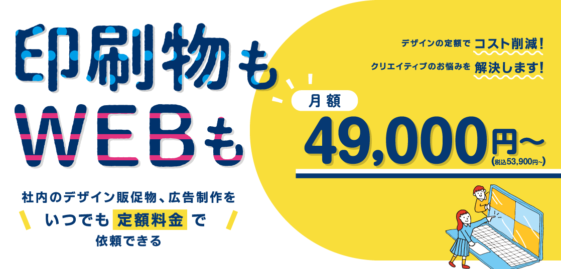 広報・販促担当者の心強いパートナーとして、デザイン業務をサポート。社内のデザイン物や広告制作を、月額49,000円(税込53,900円)からの定額制でご利用いただけます。